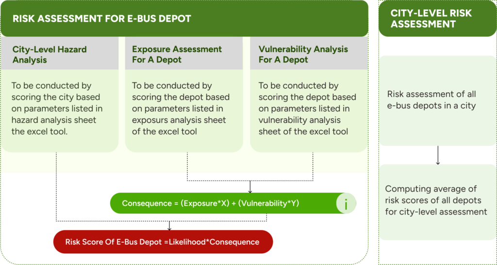 The first step of building resilient e-bus system is diagnosing the key hazards that can potentially impact the e-bus system in a city. A tailored Risk Assessment Framework is developed for conducting the analysis for Electric Bus Depots based on Bivariate Risk Matrix Method developed by the Asian Development Bank (ADB, 2016). It provides a structured, data-driven approach to identifying and evaluating the risk levels of the e-bus depots. The key components of the Risk Assessment Framework are Hazard, exposure and vulnerability.
